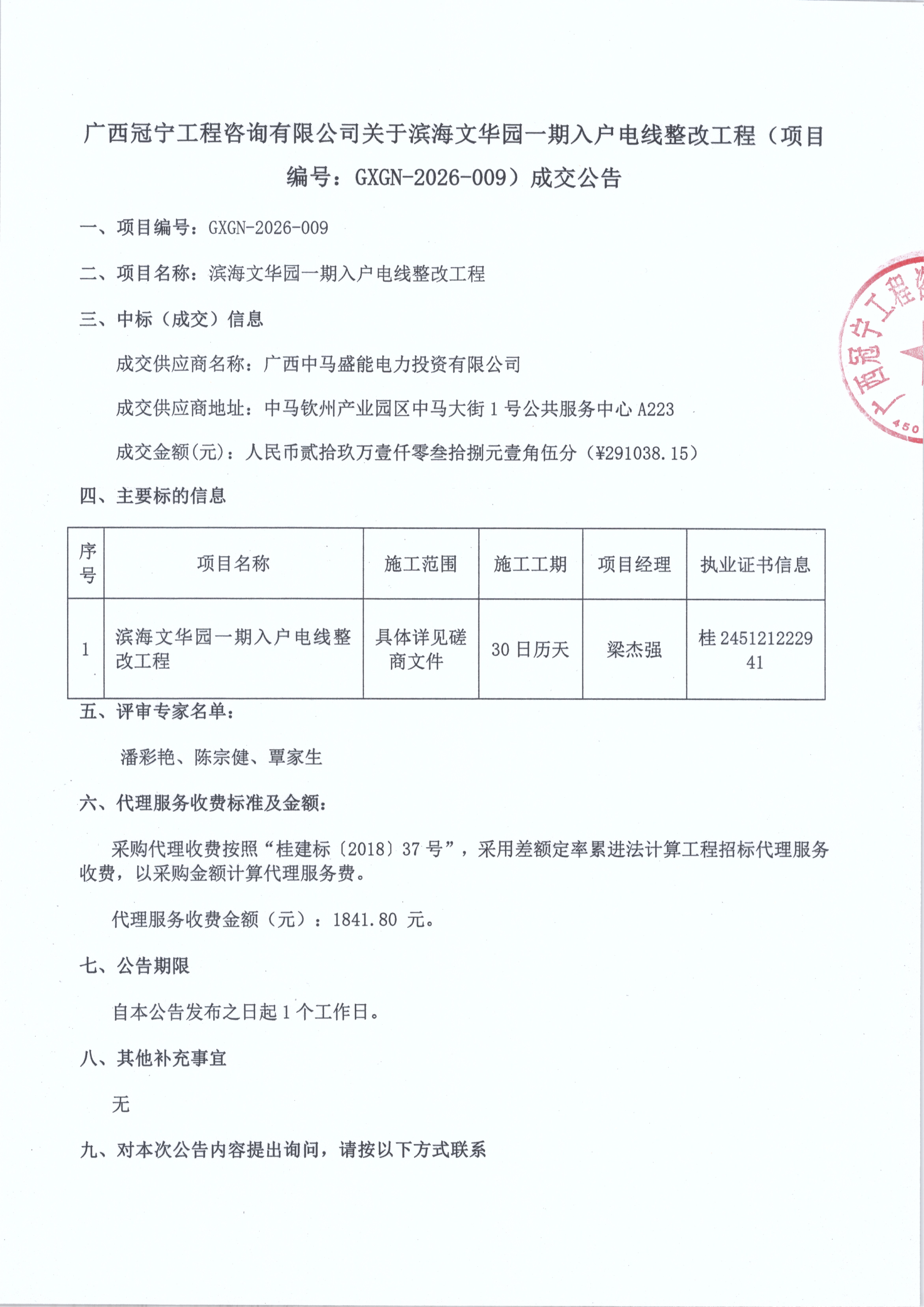 廣西冠寧工程咨詢有限公司關(guān)于濱海文華園一期入戶電線整改工程(項目 編號:GXGN-2026-009)成交公告