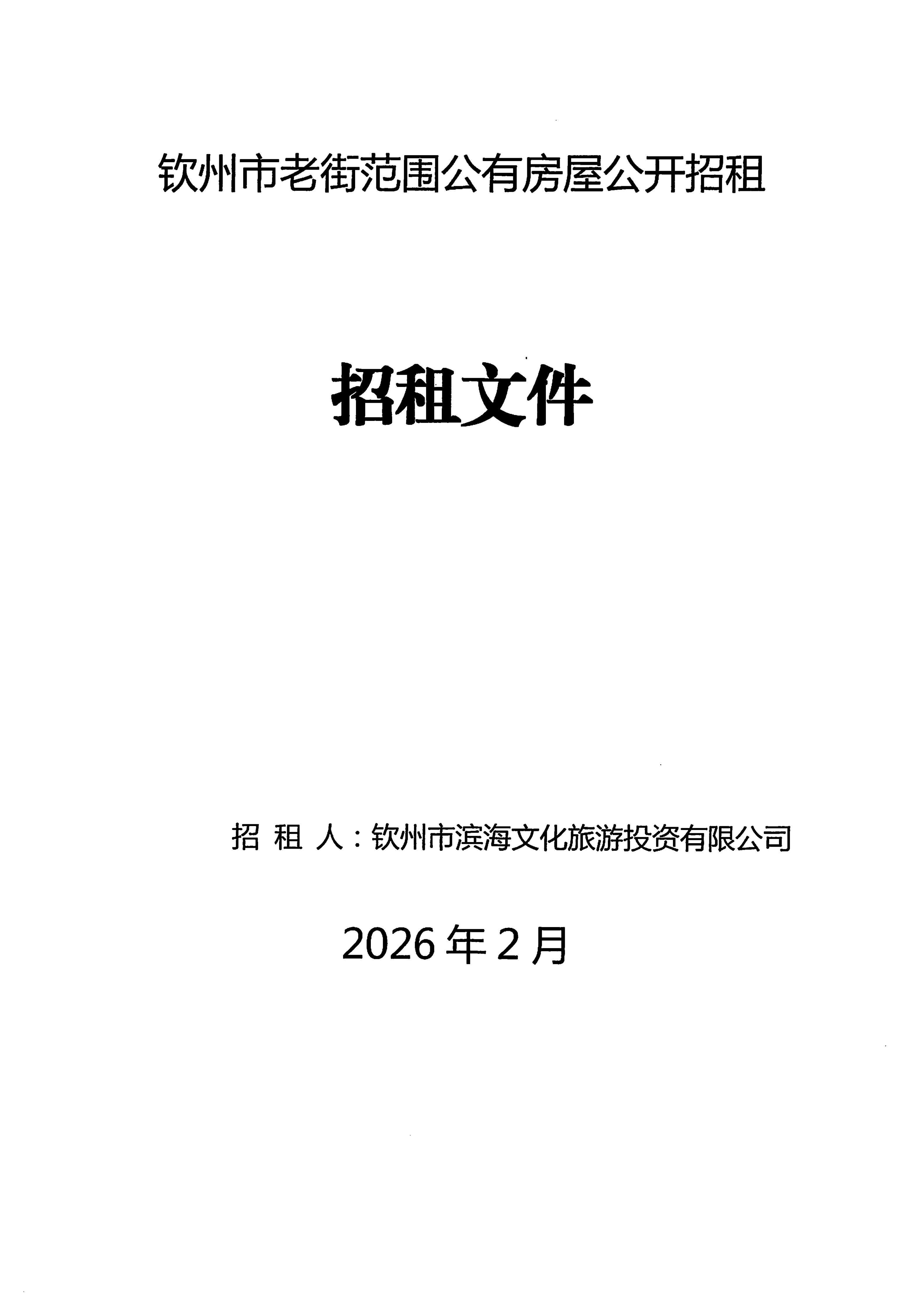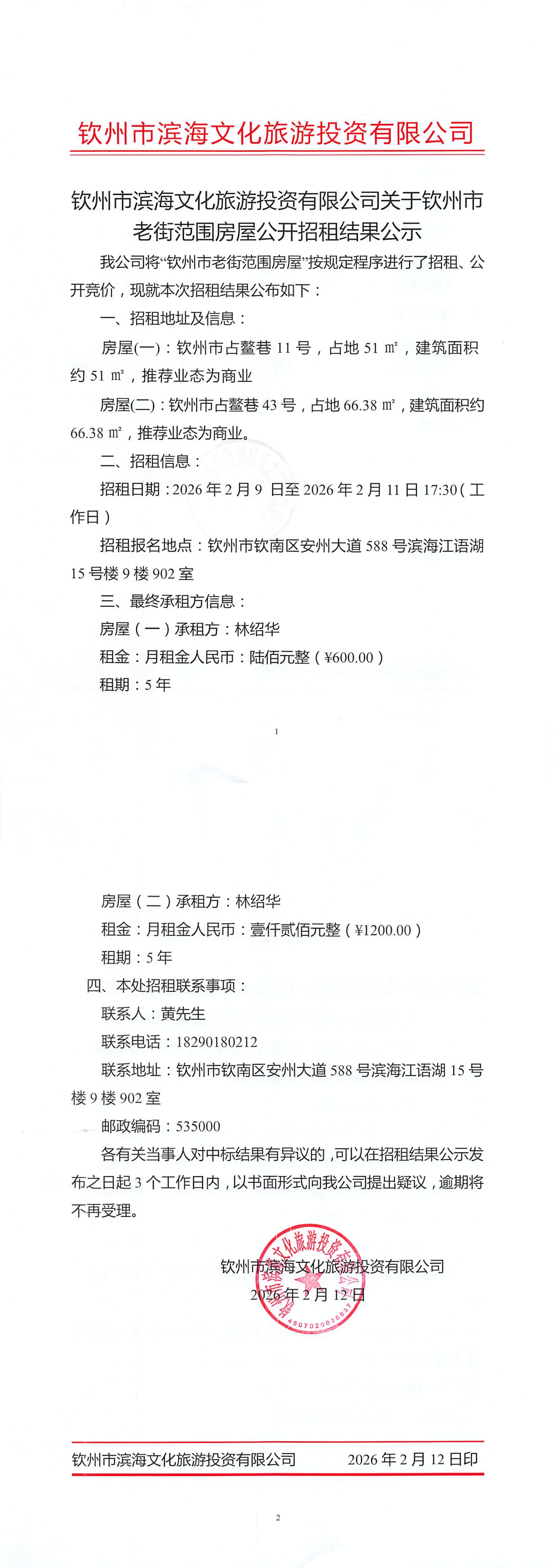 欽州市濱海文化旅游投資有限公司關(guān)于欽州市老街范圍房屋公開招租結(jié)果公示