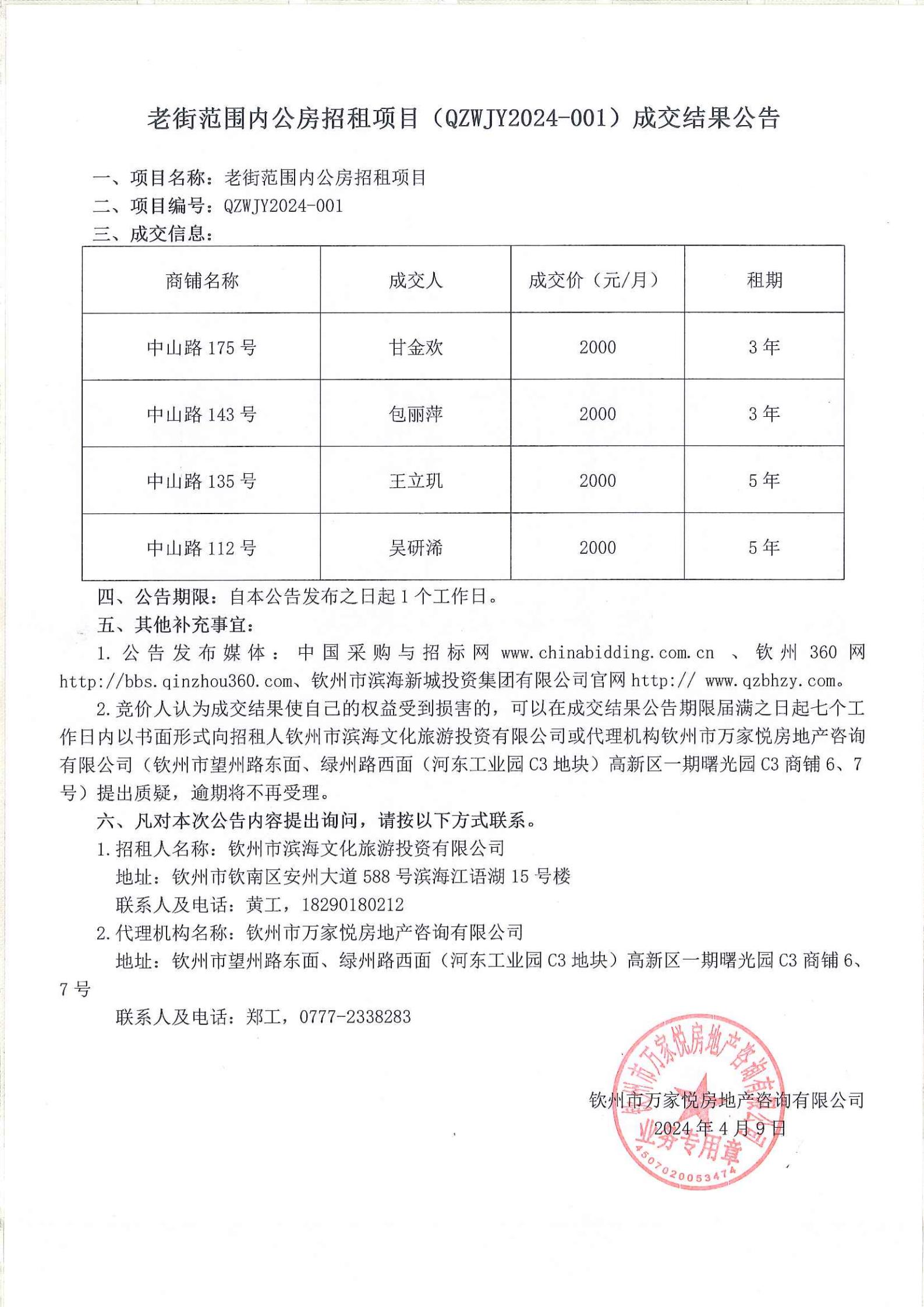 老街范圍內(nèi)公房招租項(xiàng)目(QZKR2024-001)成交結(jié)果公告