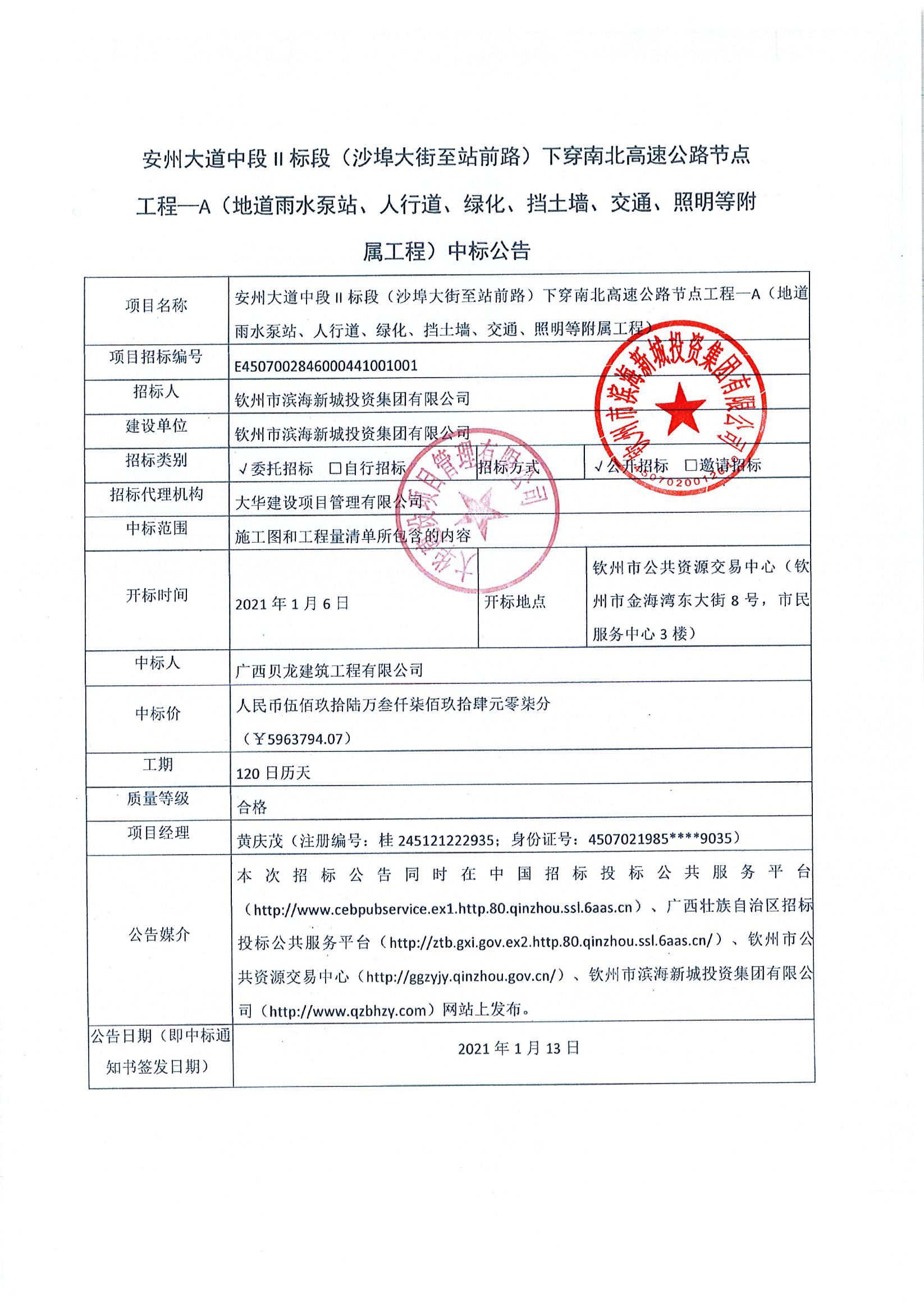 安州大道中段II標(biāo)段(沙埠大街至站前路)下穿南北高速公路節(jié)點工程—A(地道雨水泵站、人行道、綠化、擋土墻、交通、照明等附屬工程)中標(biāo)公告