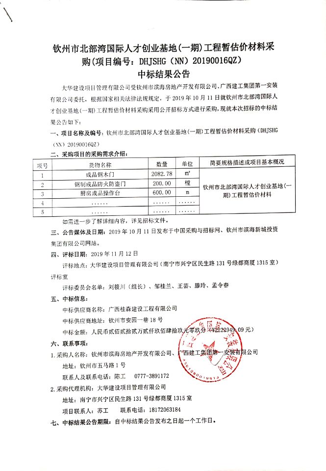 欽州市北部灣國際人才創(chuàng)業(yè)基地(一期)工程暫估價材料采購-中標(biāo)結(jié)果公告
