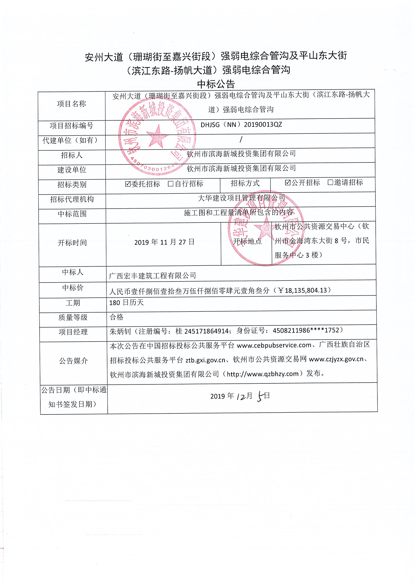 安州大道(珊瑚街至嘉興街段)強(qiáng)弱電綜合管溝及平山東大街(濱江東路-揚帆大道)強(qiáng)弱電綜合管溝-中標(biāo)公告