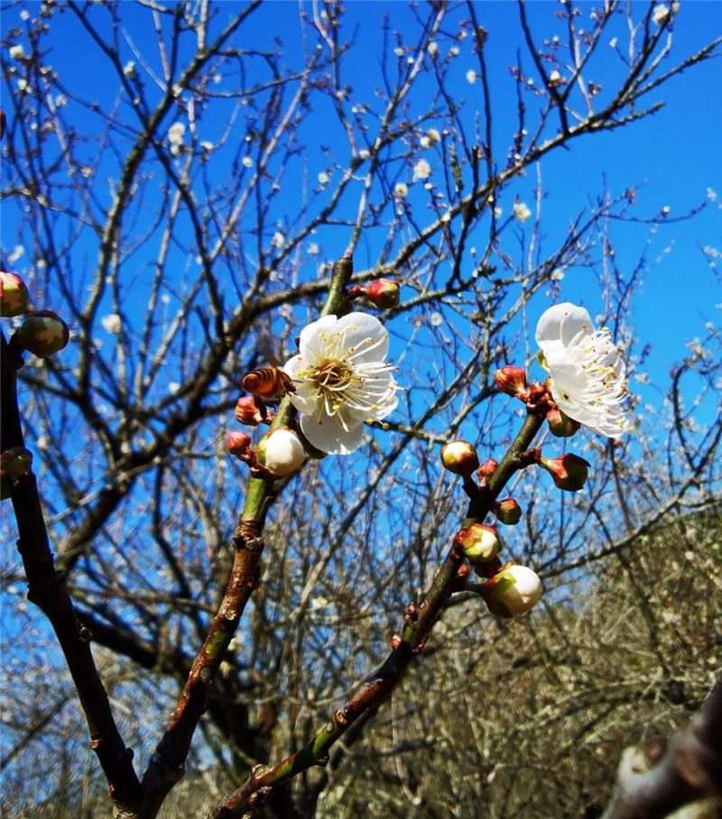 八寨溝梅園四周青山環(huán)繞,鳥語花香,當梅花盛開時,漫山遍野的梅花與青山綠水交相輝映,宛如世外桃源;當你置身其中,極目望去,朵朵梅花在艷陽冷風(fēng)中傲然綻放;遠望,一樹繁花似錦如雪,近賞,朵朵白梅挺立枝頭,小巧的花瓣,精致的花蕊,潔白無瑕,成群的蜜蜂在花間縈繞。