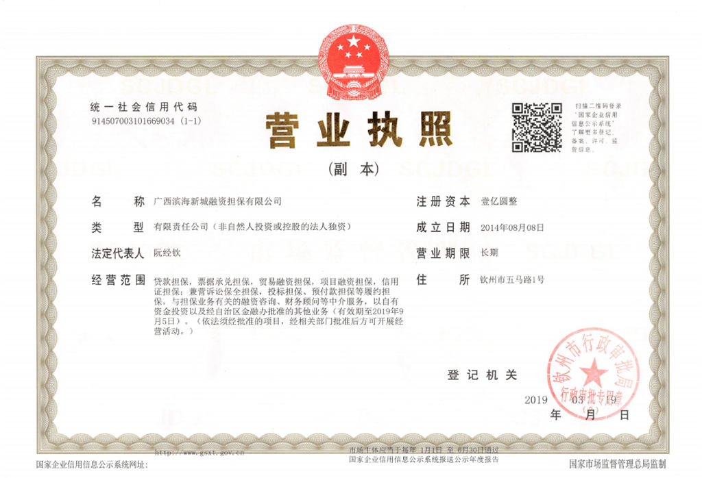 根據(jù)原廣西壯族自治區(qū)金融工作辦公室《廣西壯族自治區(qū)金融工作辦公室關(guān)于印發(fā)2018年全區(qū)融資擔(dān)保公司現(xiàn)場檢查工作方案的通知》(桂金辦融函〔2018〕106號(hào))的整改要求,我擔(dān)保公司立即展開公司名稱的變更工作。經(jīng)欽州市行政審批局同意,于2019年3月19日完成公司名稱的變更并取得新營業(yè)執(zhí)照,變更后的名稱為“廣西濱海新城融資擔(dān)保有限公司”。