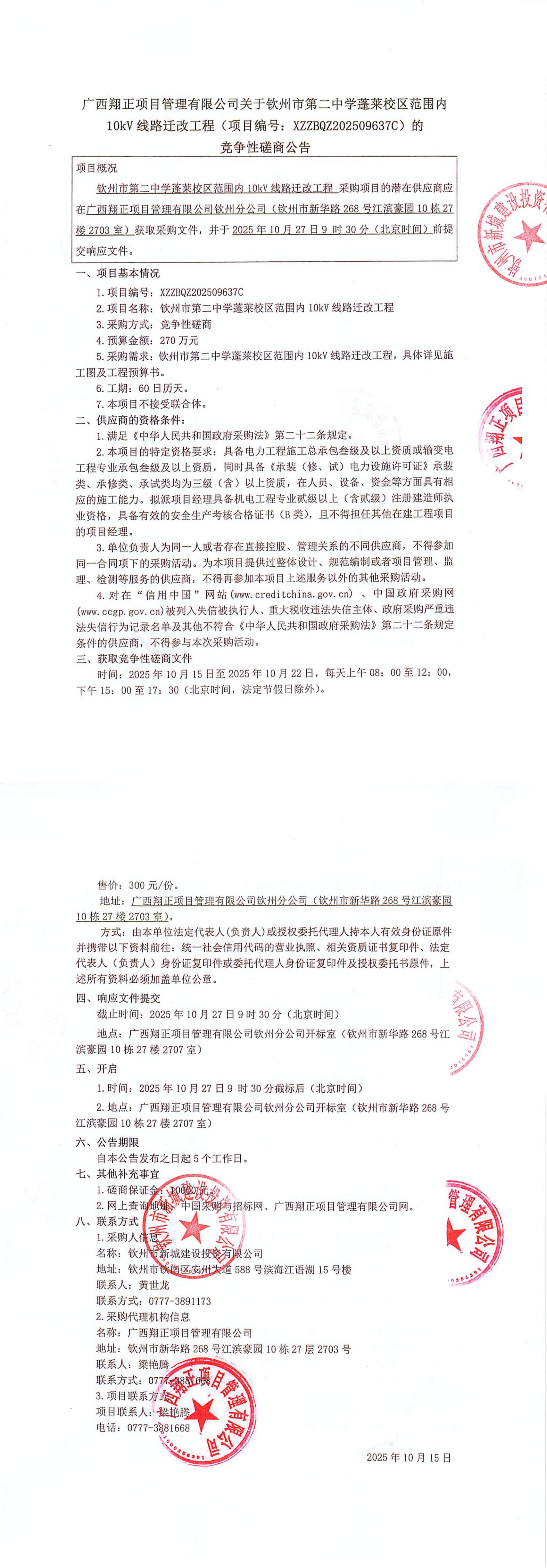 廣西翔正項(xiàng)目管理有限公司關(guān)于欽州市第二中學(xué)蓬萊校區(qū)范圍內(nèi)10kV線(xiàn)路遷...