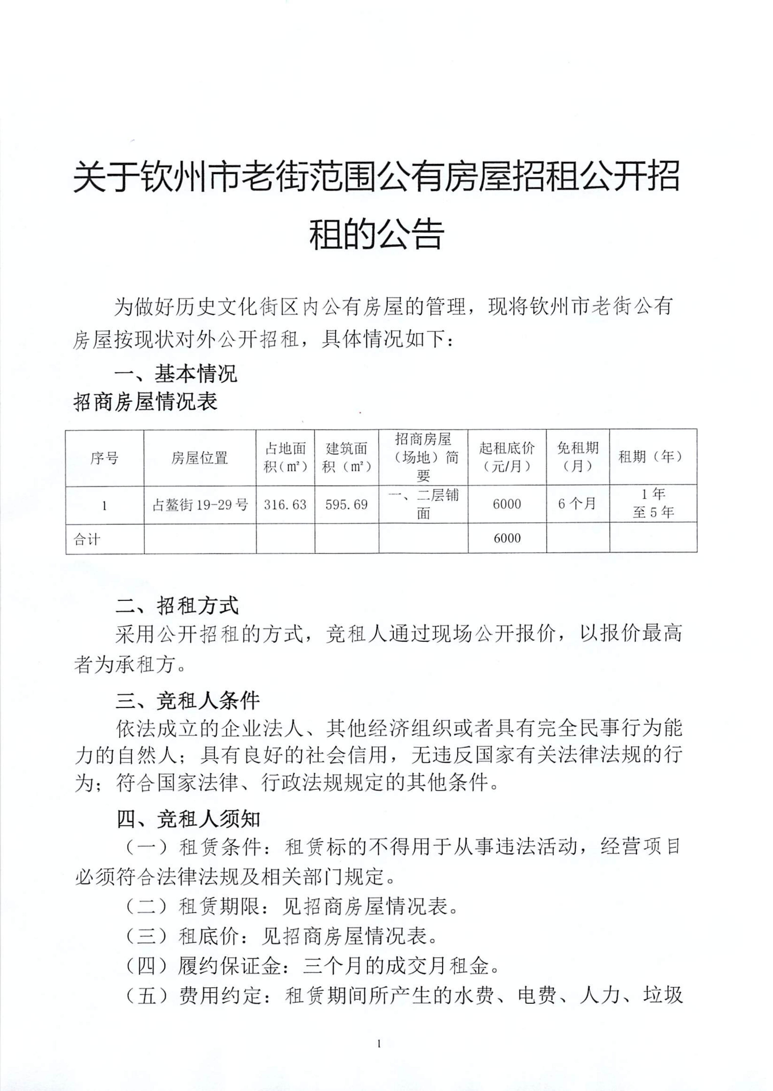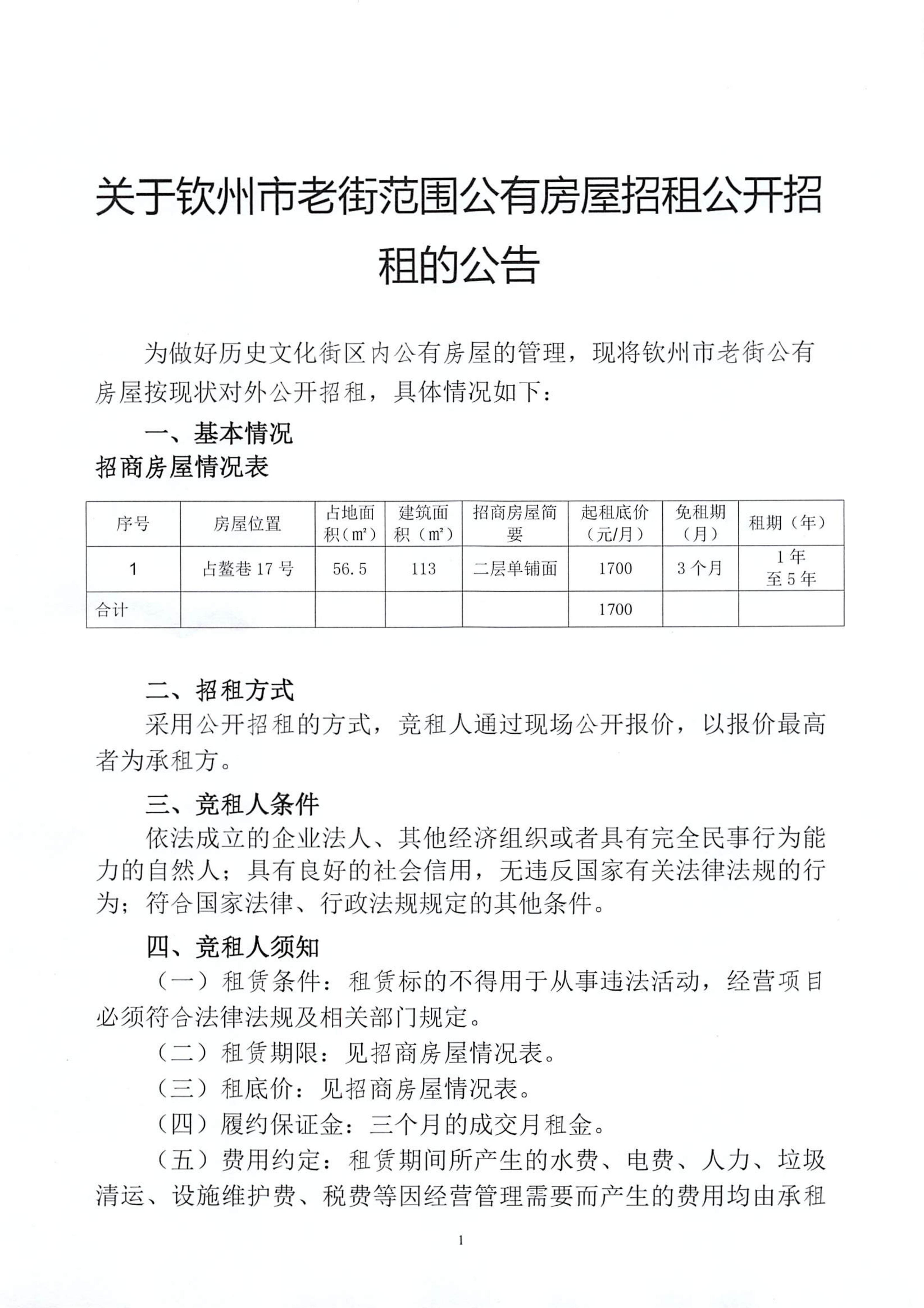 關(guān)于欽州市老街范圍公有房屋招租公開(kāi)招租的公告(占鰲巷67號(hào))