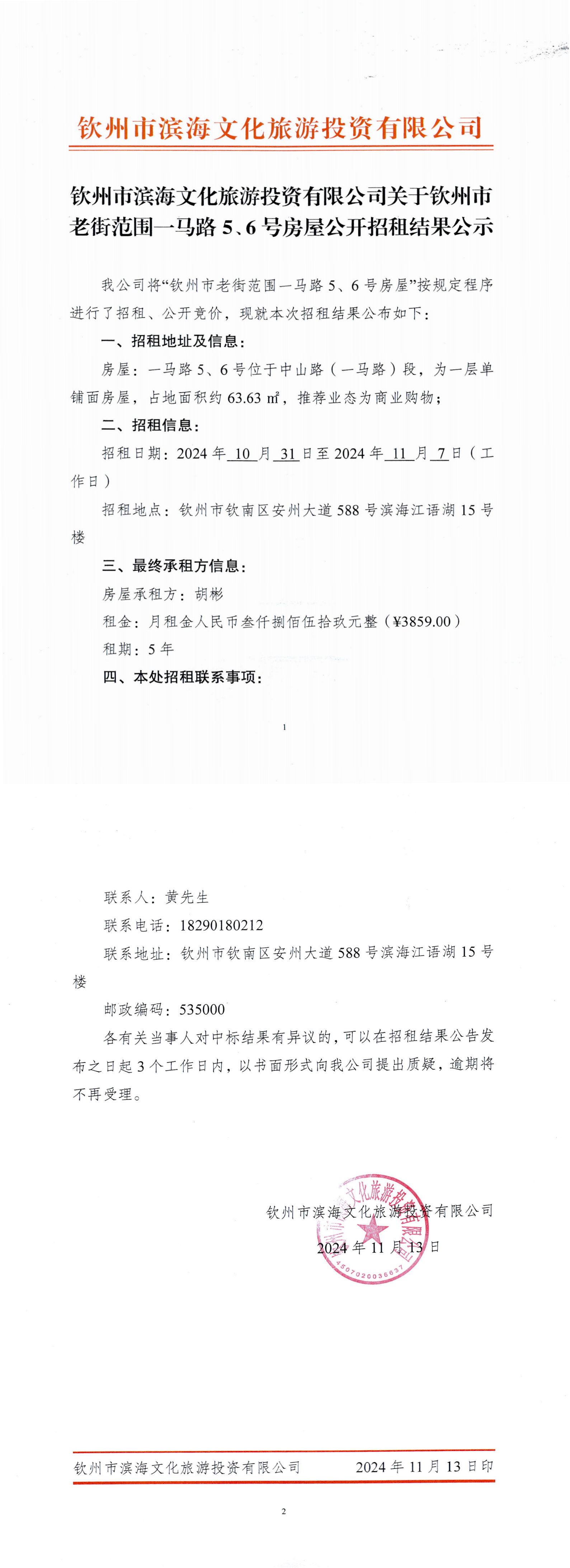欽州市濱海文化旅游投資有限公司關(guān)于欽州市老街范圍一馬路5、6號房屋公開招租結(jié)果公示