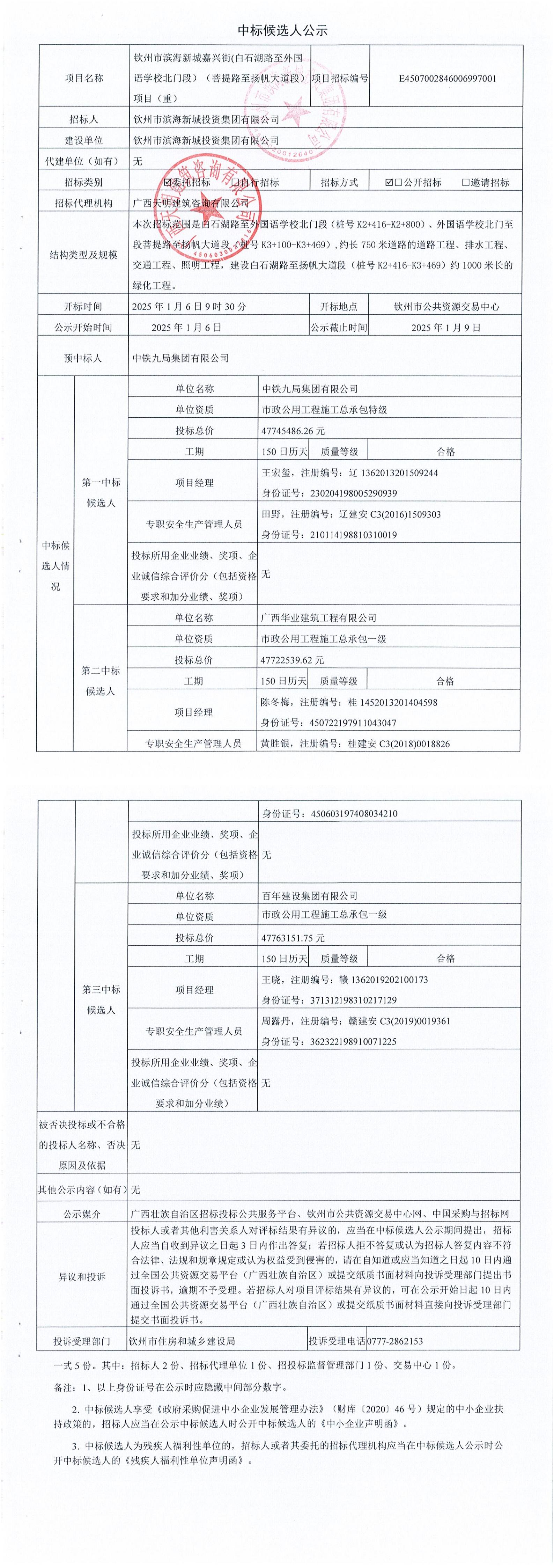 欽州市濱海新城嘉興街(白石湖路至外國語學(xué)校北門段)(菩提路至揚(yáng)帆大道段)項目(重)中標(biāo)候選人公示
