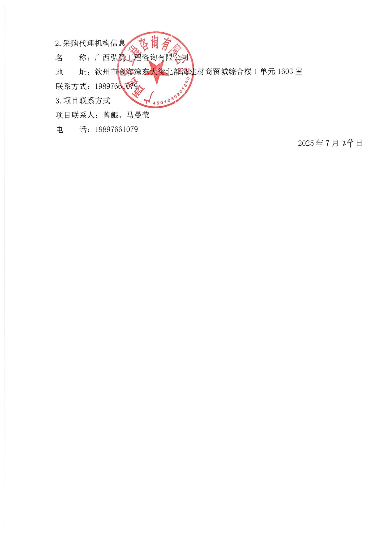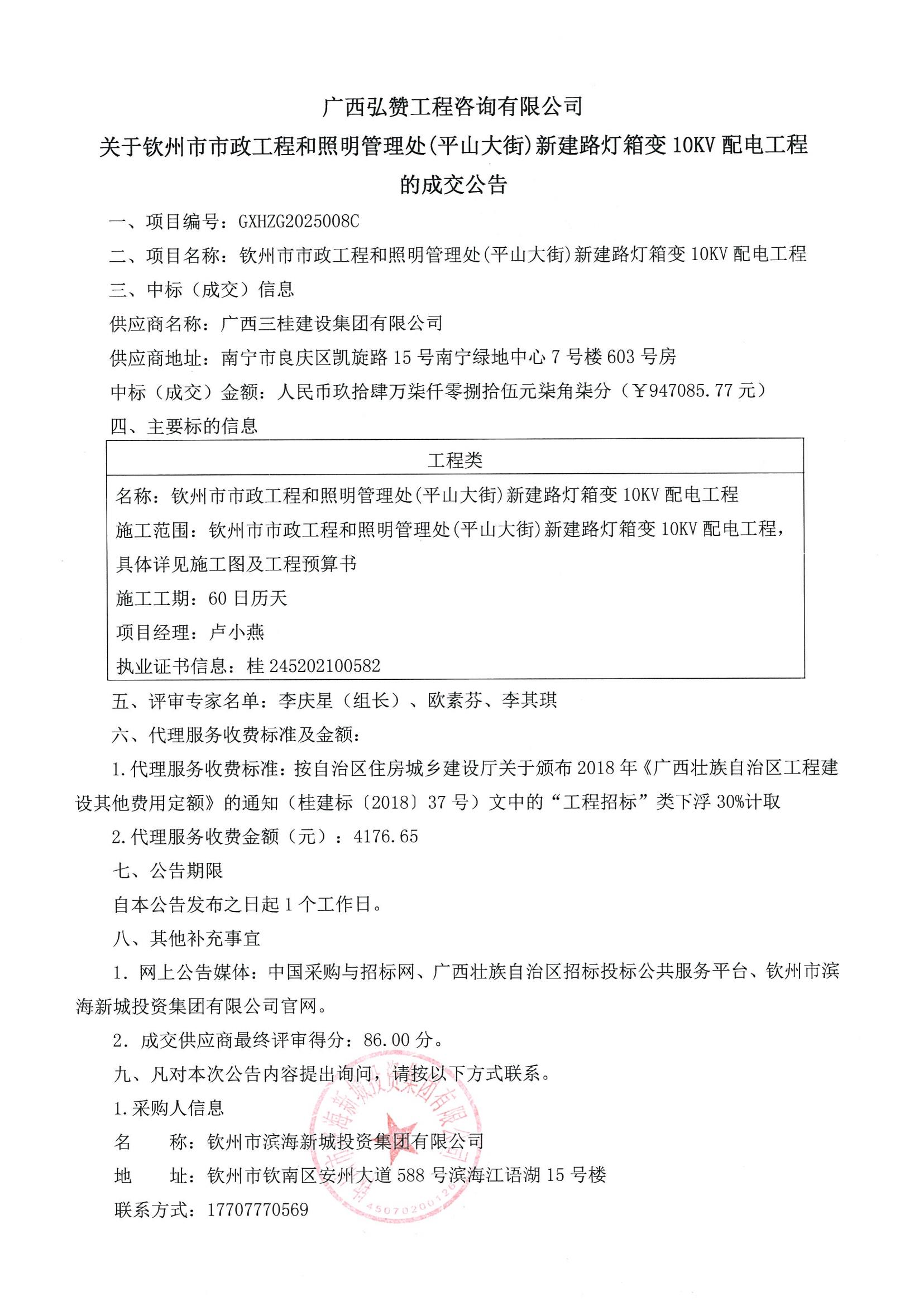 廣西弘贊工程咨詢有限公司關(guān)于欽州市市政工程和照明管理處(平山大街)新建路燈箱變10KV配電工程的成交公告