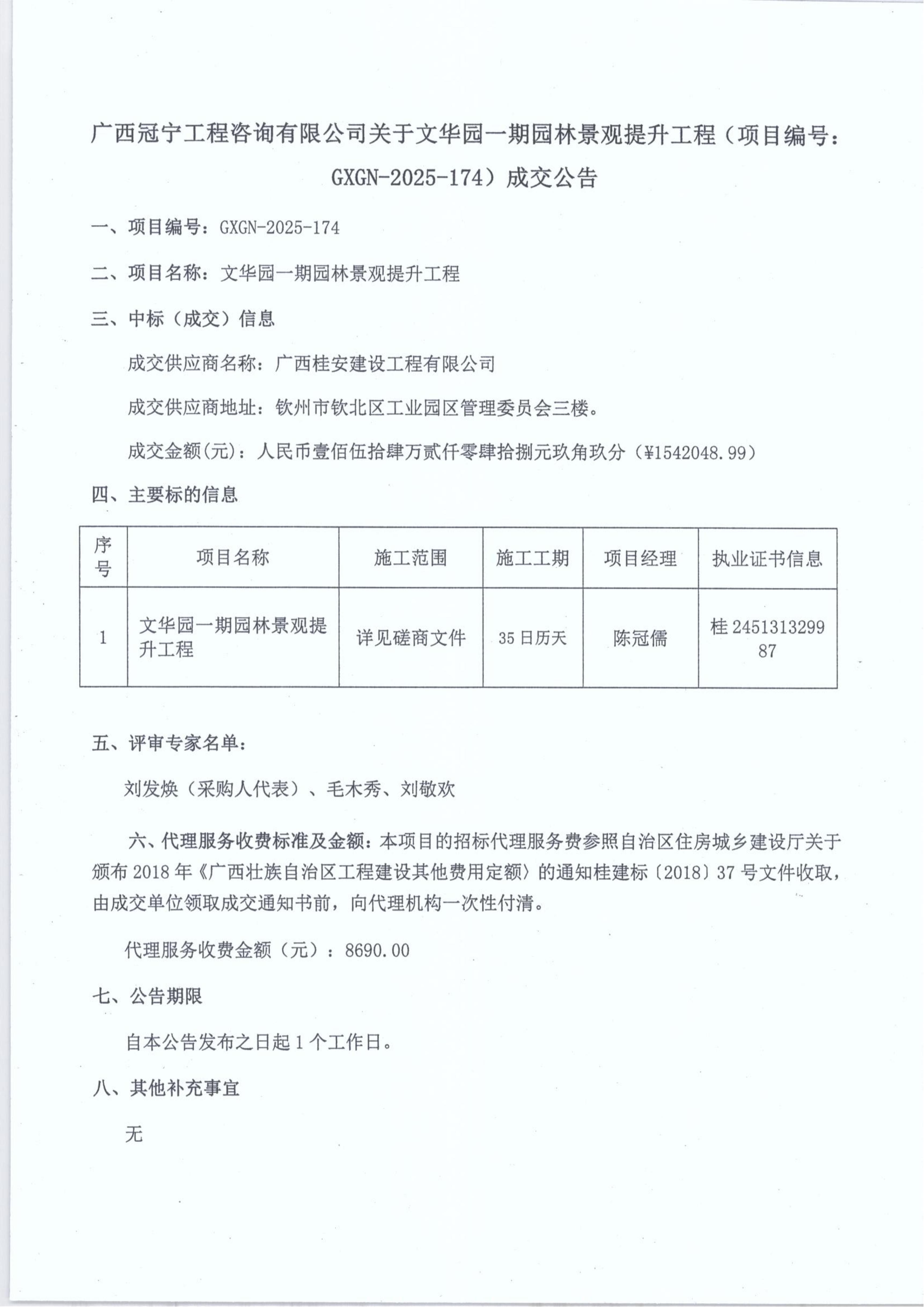 廣西冠寧工程咨詢有限公司關(guān)于文華園一期園林景觀提升工程(項(xiàng)目編號(hào):GXGN-2025-174)成交公告