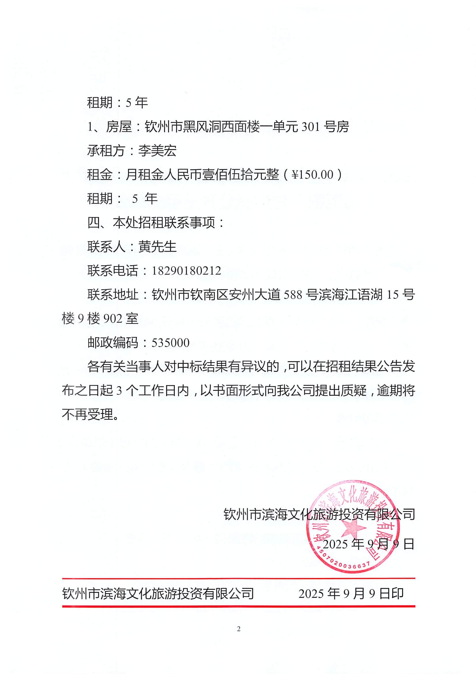 欽州市濱海文化旅游投資有限公司關(guān)于欽州市老街范圍2處房屋公開招租結(jié)果公示