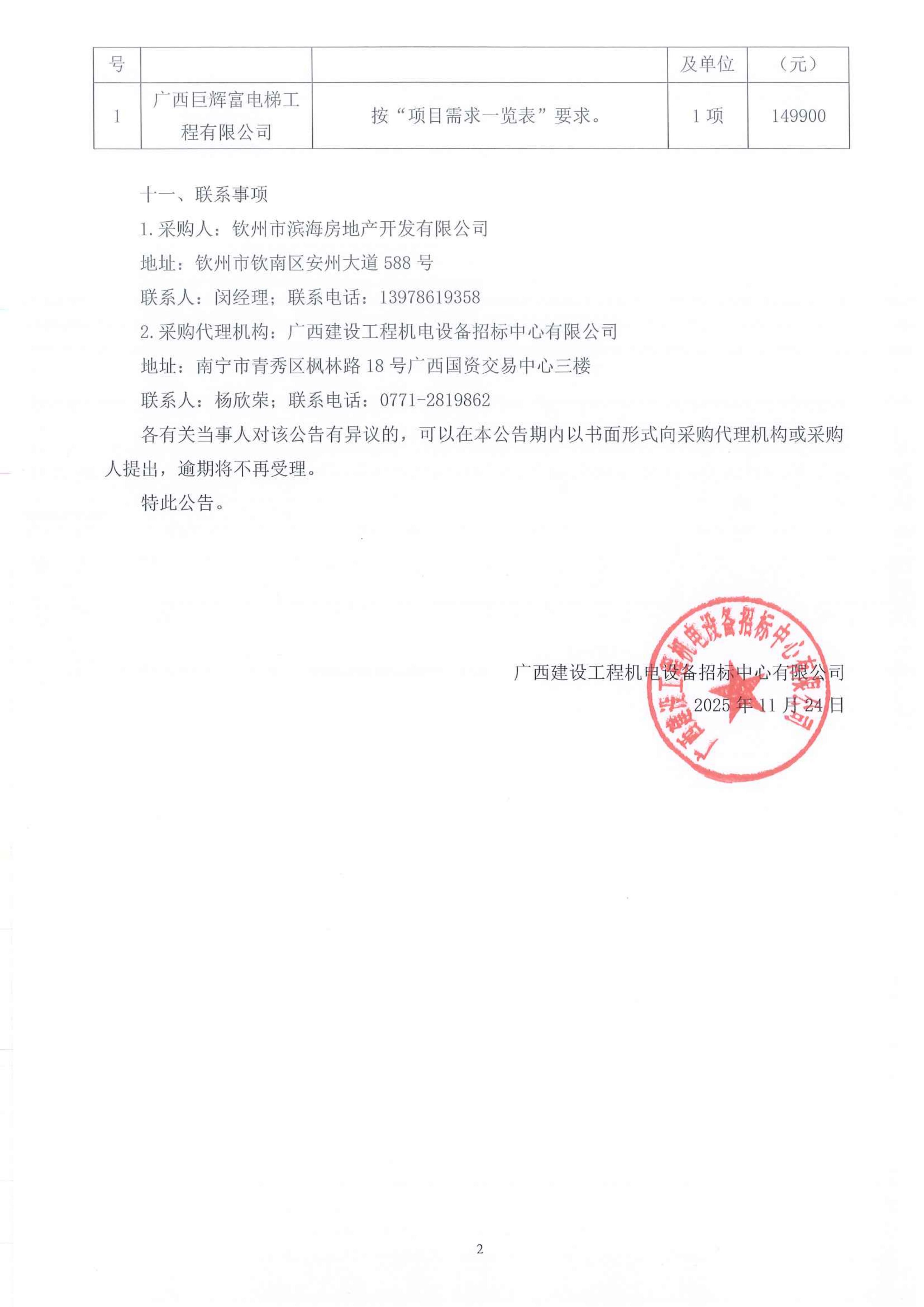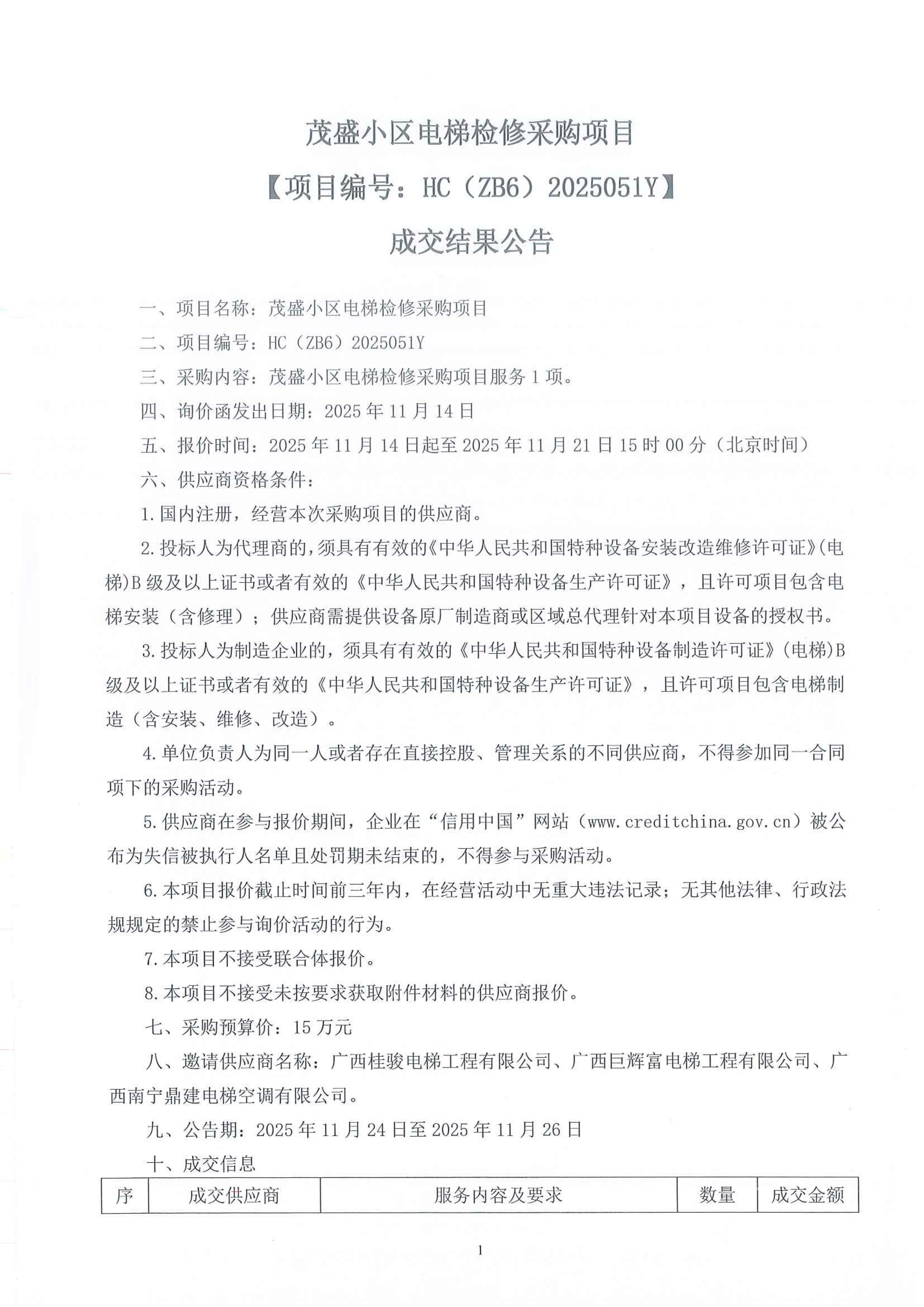 茂盛小區(qū)電梯檢修采購(gòu)項(xiàng)目【項(xiàng)目編號(hào):HC(ZB6)2025051Y】 成交結(jié)果公告