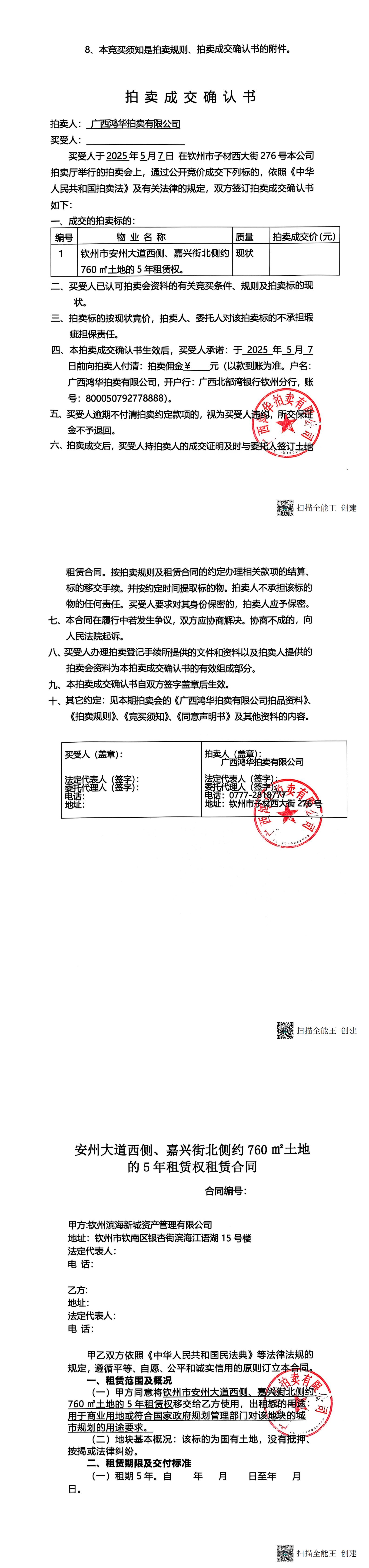 欽州市安州大道西側(cè)、嘉興街南北側(cè)約760㎡土地的5年租賃權(quán)拍賣文件